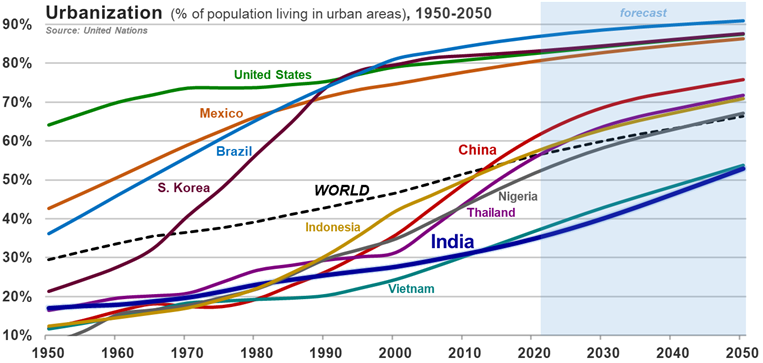 - United Nations, Department of Economic and Social Affairs, Population Division. World Urbanization Prospects (2018), File 2: Percentage of Population at Mid-Year Residing in Urban Areas by region, subregion and country, 1950-2050; and File 3: Urban Population at Mid-Year by region, subregion and country, 1950-2050. Retrieved from https://population.un.org/wup